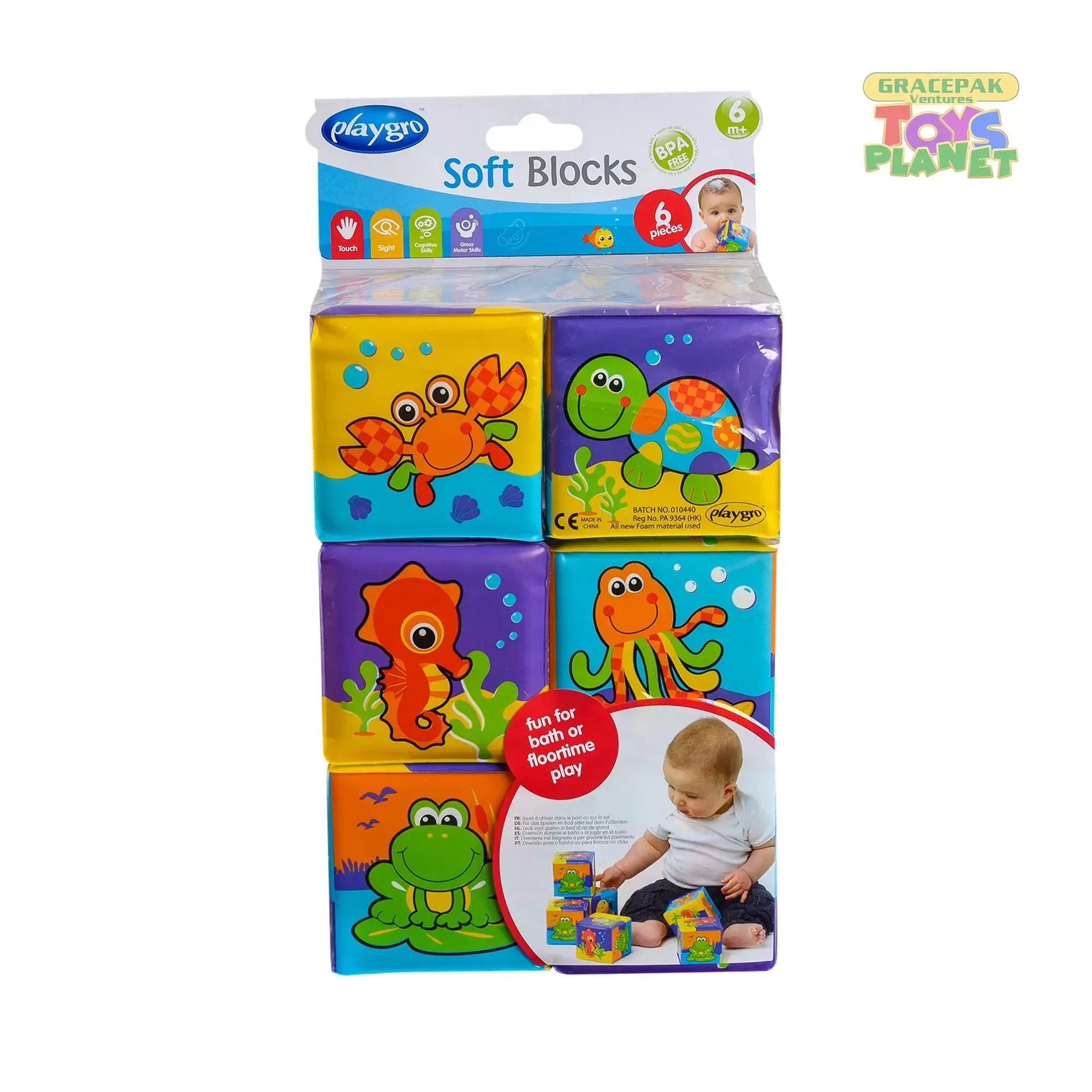 Our Playgro My First Soft Blocks makes bath-time so much fun. The soft blocks, with bright, bold colors and cute animal designs make bath time so much fun for your little one! Each pack contains six soft blocks that are great for promoting a baby’s motor skills, hand-eye coordination and cognitive thinking through stacking or knocking them down. Vibrant colors help build visual perception skills 6 soft, water-proof padded blocks Perfect for the bath, pool, beach or general play For ages 6+ months STEAM/STEM toys for a bright future Fully sealed, no holes, no molds