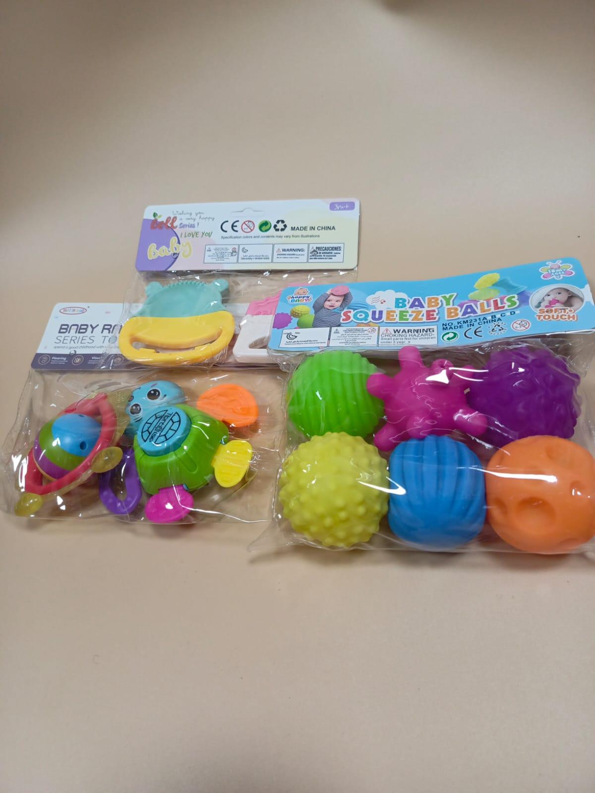 baby rattles bundle contains the following items; .baby rattle, baby teethers, squeeze ball