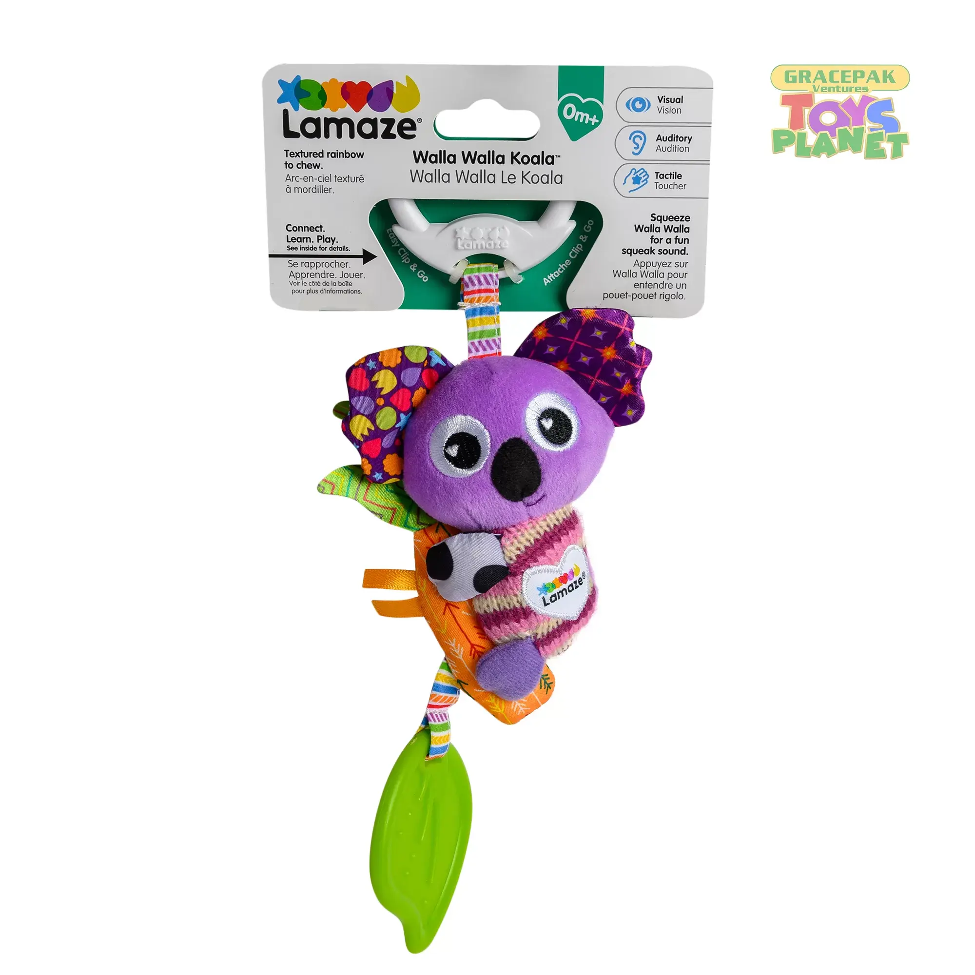 Our Lamaze Walla Koala Clip & Go is ready to entertain baby with plenty to explore. Interesting textures and crinkling sounds make grabbing and squeezing more fun. Give him a hug for a fun squeak too! This hands-on baby toy is perfect for helping the baby develop tactile skills. Cute koala also features high contrast patterns and bright colors that provide the baby with visual stimulation during playtime. Koala’s textured chewy leaf encourages the baby to explore with both hands and mouth.
