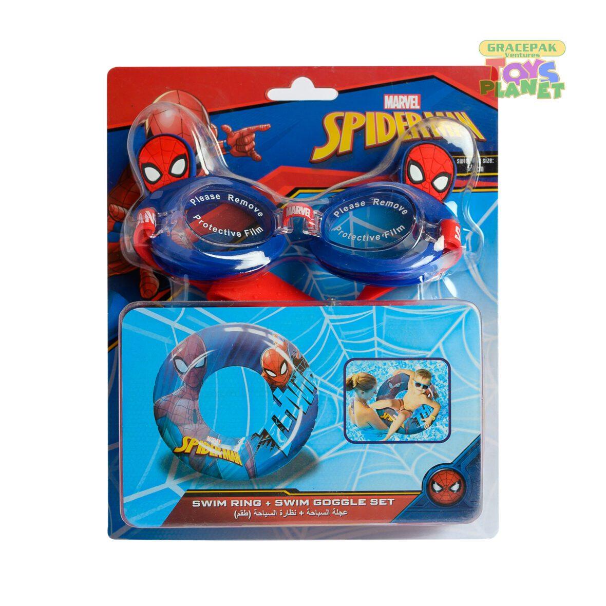 Marvel Spiderman Swim Ring and Goggles Set contains inflated Spiderman printed swim ring and matching 3D Swimming goggle set. The ring measures 51cm in diameter and the goggles are free size. Age Recommendation 3-8 years Durable High quality Lightweight Best gift